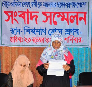 লিখিত বক্তব্যে আরও উল্লেখ করা হয়েছে, দুই কন্যা সন্তান ও ঋনের বুঝা নিয়ে বর্তমানে আফিয়া বেগম খুব কষ্টের মধ্যে দিন যাপন করছেন। পারিবারিক দূর্ভোগ লাগবের জন্য আফিয়া বেগম নিজের নামীয় বা কাবিনের জায়গা বিক্রি করতে চাইলে তার ভাসুর-দেবর-ভাসুর পুত্ররা তাদেরকে (আফিয়া ও তার মেয়েদের) ভয়ভীতি প্রদর্শন করে এবং জমি ক্রয় করতে ইচ্ছুক ব্যক্তিকে বাঁধা প্রদান করে। এরই অংশ হিসেবে ২০১৭ সালের ২০ ফেব্রুয়ারী প্রতিপক্ষের লোকজন আফিয়া গংদের ঘরে প্রবেশ করে তাদেরকে হত্যা করার উদ্দেশ্যে শারীরিক নির্যাতন করে। এঘটনায় ২৯ ফেব্রুয়ারী তাদের বিরুদ্ধে থানায় লিখিত অভিযোগ দায়ের করেন আফিয়া। কিন্তু প্রতিপক্ষের লোকজন অত্যান্ত প্রভাবশালী হওয়ায় বিয়টি ধামাচাপা দিয়ে দেয়। এরপর থেকে অভিযুক্তরা (আহমদ-ফারুক-বকুল-হাবিবুর গংরা) প্রায়ই আফিয়া বেগমের টিনসেডের ঘরের বেড়া ও চালে ইট-পাটকেল নিক্ষেপ করে ভয়ভীতি প্রদর্শন করে আসছে। ফলে তিনি নিজের প্রাপ্ত বয়স্ক মেয়েকে নিয়ে অসহায়ন্তের মধ্যে জীবন-যাপন করছেন। সর্বশেষ গত ১৬ নভেম্বর অভিযুক্তরা ফরিদাকে তার জমিতে ধান কাটার লোক পাঠাইলে জানে মেরে ফেলবে বলে হুমকি দিয়ে জোরপূর্বকভাবে তাদের (আফিয়া) জমির ধান কেটে নিয়ে গেছে। তাই কুচক্রী মহলের কাছ থেকে আফিয়া বেগম ও তার মেয়েদের সম্পত্তি রক্ষা ও প্রতিপক্ষের অত্যাচার থেকে তাদেরকে (আফিয়া গং) মুক্ত করার জন্য সংশ্লিস্ট কর্তৃপক্ষসহ সরকারের সুদৃষ্টি কামনা করা হয়েছে সংবাদ সম্মেলনে।